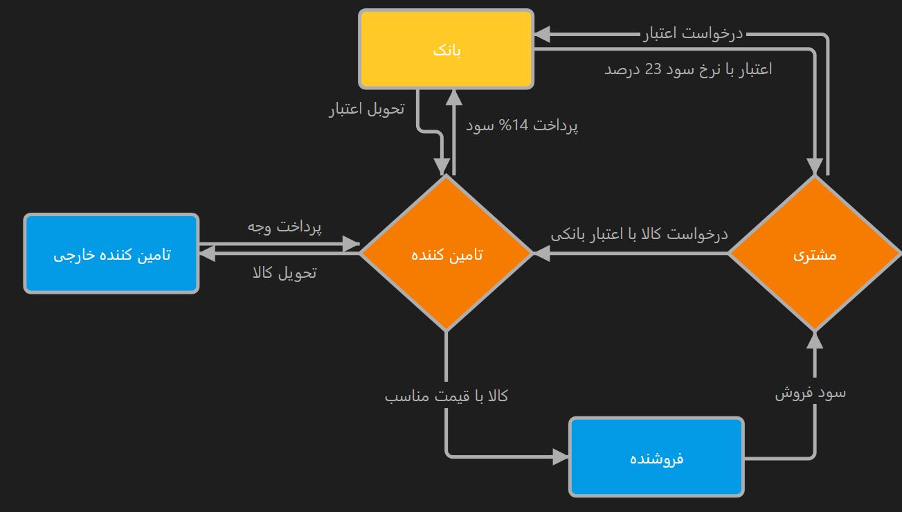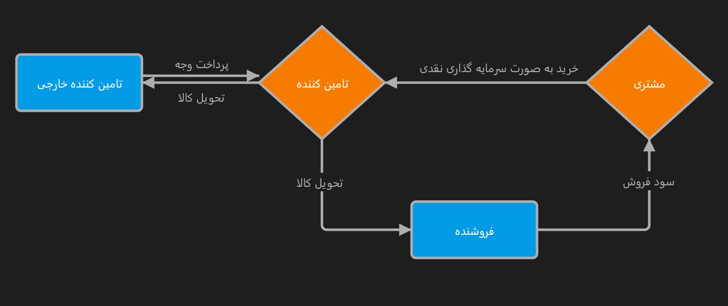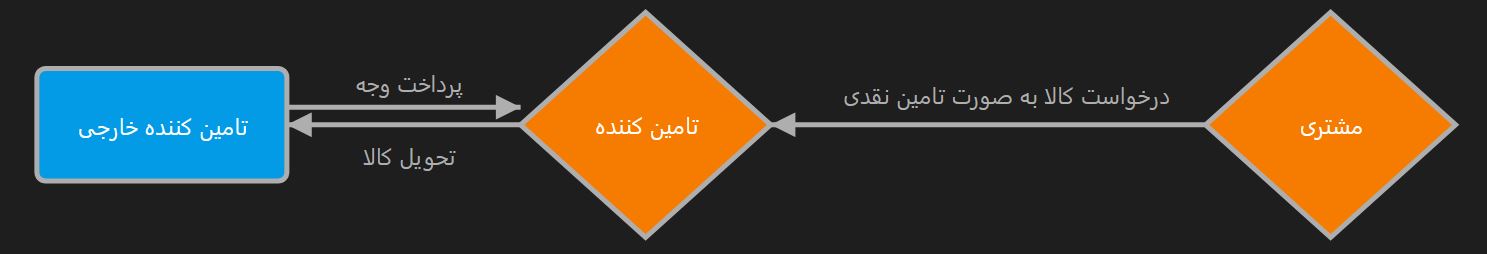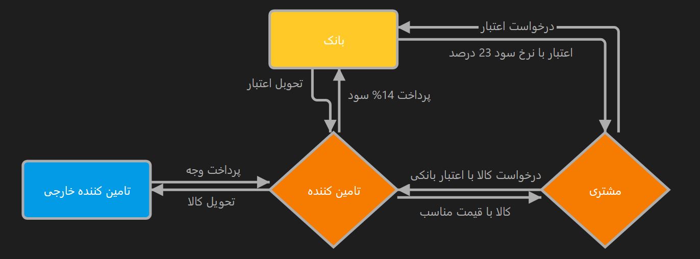 با توجه به دیاگرام بالا ابتدا درخواست کننده از بانک درخواست SDF میکند و بانک با نرخ سود 23% حواله را به شرکت درخواست کننده انتقال میدهد. شرکت درخواست کننده حواله را به تامین کننده داخلی انتقال داده و در این مرحله تامین کننده با بانک مذاکره کرده و بانک 14% نیز از تامین کننده بانک دریافت میکند.تامین کننده موظف است اسنادی مبنی بر نحوه خرید ، محصول مورد مذاکره و کشور مورد مذاکره برای خرید به بانک ارائه دهد و ثابت کند که حواله SDF به چه نحو خرج میشود. پس از خرید محصول ، محموله خریداری شده به درخواست کننده تحویل داده میشود.لازم به ذکر است که بار فوق 4% زیر قیمت عرف بازار تحویل خریدار میشود. در صورتی که درخواست کننده عامل توزیع(مشتری) داشته باشد می تواند درخواست انتقال محموله به ایشان را از تامین کننده بکند.سود درخواست کننده بار در صورت تحویل بار به عامل توزیع(مشتری) بین 1% الی 10% می باشد.